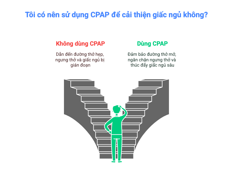 - Không dùng CPAP: Đường thở hẹp → mô mềm xẹp xuống → ngưng thở → giảm oxy → thức giấc.