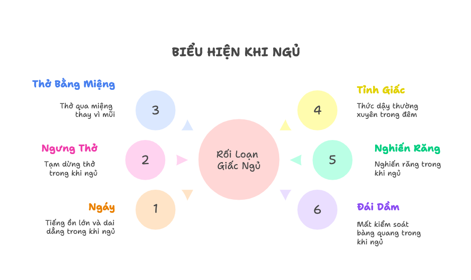 - Há miệng khi ngủ, thở khò khè, ngưng thở từng lúc.