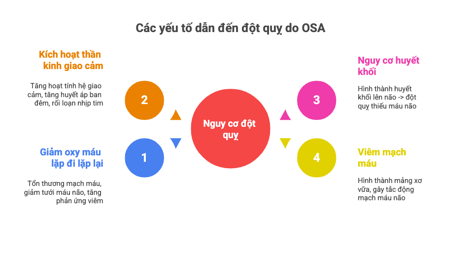 OSA làm tăng tỷ lệ rung nhĩ, một rối loạn nhịp có thể hình thành huyết khối ở tâm nhĩ → đẩy huyết khối lên não → đột quỵ thiếu máu não.